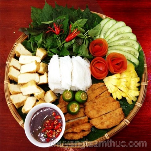 – rau thơm: rau kinh giới, tía tô, dưa chuột và chút rau húng ăn kèm.