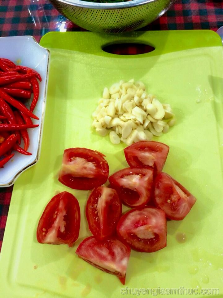 – Đun nước sôi rồi cho ớt, cà chua vào luộc khoảng 3 phút rồi đổ ra rổ cho ráo nước.